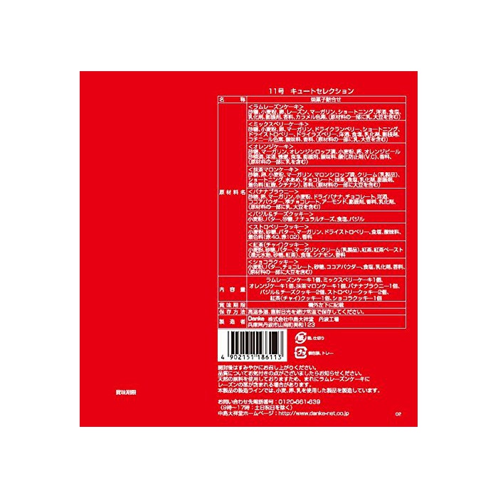 원재료:〈램 레이의《게키》〉설탕,소맥분,알,레이의《》,마가린,쇼트닝,양주,식염,유화 제,팽창 제,향료,카라멜 색소,(원재료의 일부에 젖,대두를 포함한다)〈믹스 베리 케익〉설탕,소맥분,알,마가린,드라이 크랜베리,쇼트닝,드라이 스트로베리,드라이《라즈베리》,양주,식염,유화 제,팽창 제,《고치니루》색소,신맛료,향료,(원재료의 일부에 젖,대두를 포함한다)〈오렌지 케익〉설탕,마가린,오렌지 시럽지,소맥분,알,오렌지 pea《루》,설탕지,양주,벌꿀,식염,팽창 제,신맛료,산화 방지제(v.c)고, 향료,(원재료의 일부에 젖을 포함한다)〈녹차 메론 케익〉설탕,알,소맥분,마가린,메론 시럽지,크림(유제품)고, 쇼트닝,물엿,쵸코렛,녹차,식염,유화 제,팽창 제,착색료(홍누룩,치자나무)고, 향료,(원재료의 일부에 대두를 포함한다)〈바나나 브라 성게알《―》〉설탕,알,마가린,소맥분,드라이버 나나,쵸코렛,양주,코코아 파우더,준쵸코렛,아몬드,팽창 제,향료,유화 제,(원재료의 일부에 젖,대두를 포함한다)〈바질&치즈 쿠키〉소맥분,버터,설탕,내츄럴 치즈,식염,바질〈스트로베리 쿠키〉소맥분,설탕,버터,마가린,드라이 스트로베리,식염,신맛료,착색료(적40,적102)고, 향료〈홍차(챠이)쿠키〉소맥분,설탕,버터,마가린,크림(유제품)고, 홍차,홍차 Paste(환원 수 엿,설탕,홍차)고, 식염,시나몬,향료〈초콜릿 쿠키〉소맥분,버터,쵸코렛,설탕,코코아 파우더,식염,유화 제,향료,(원재료의 일부에 대두를 포함한다)