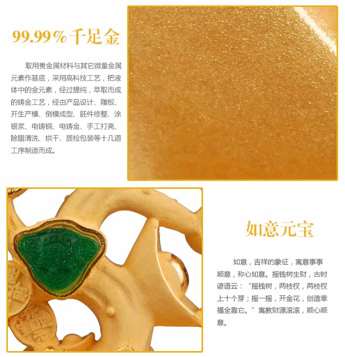 Answer: 1:?a thousand gold decoration?can be divided into two categories:?1000 sufficient bullion?and?thousand foot?cast gold.?The former is?all?made of pure gold.?Thousand foot?cast gold?is goldelectroforming technique?with?advanced?surface,?surface?electroforming1000 sufficient bullion,?containing?gold.?No gold?plated?products.