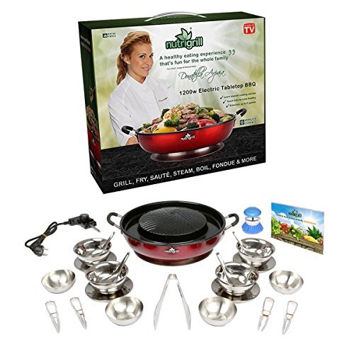 It is lightweight, with two handles for easier use with a 9 inch non-stick cooking surface and the sauce moat provides a total diameter of 14 inches. The grill comes complete with, 4 stainless bowls, 4 smaller sauce bowls, 1 stainless steel chef tongs, 4 individual cooking tongs, 4 sauce spoons and 4 small stainless plates.