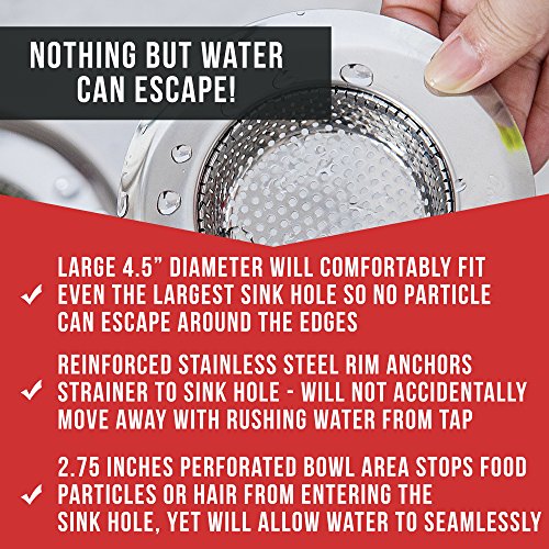 - STRONG STAINLESS STEEL MESH STRAINERS - Professional quality rust-free gadgets built to last a lifetime. Perforated bowl area of 2.75 inches that stops food particles or hair from entering the sink hole. Yet will allow water to seamlessly flow and drain.