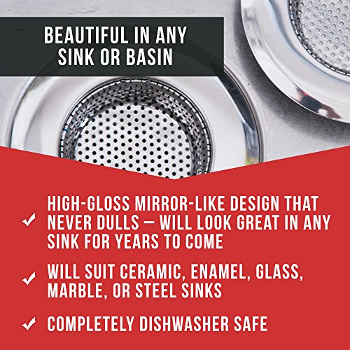 - EASILY WASH WITH SOAP AND WATER, OR THROW INTO DISHWASHER – Stainless steel is completely rust and corrosion free. Wash after wash, these sink strainers will not dull or corrode, and will keep their mirror-like shine.