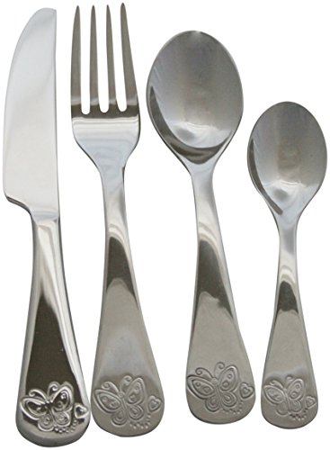 -. Feature : Kid-sized flatware is perfect for children's small hands / Features adorable butterfly designs on the tip of the handle / Includes small spoon, large spoon, fork and dinner knife / Dishwasher safe and stain resistant / Perfect for kids who want to eat by themselves but aren't big enough for full-size utensils