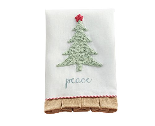 Linen towels with trimmed and pleated burlap hems feature hand-tied French knot tree embroidery. The perfect addition for Christmas!.