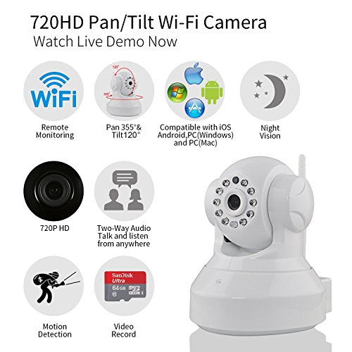 -. Feature : EASY SETUP: Sonic Recognition Technology featuring One Key WiFi(Not support 5G wifi) Configuration makes setup so quick and easy, .Just plug in the power cable, download the iSmartViewPro App and set it up via your iPhone or Andriod smartphone, remote access to the IP camera on iPhone/ iPad/ Android phone/ tablet/ MAC/PC, keep an eye on your loves and belongs anywhere anytime. / MOTION DETECTION: When the camera detected abnormity or alarm is triggered, instant alarm pictures will be sent to E-Mail. Motion detection sensibility can be adjusted by yourself. Supports Local Configuratiion, Micro SD Card cycled recording, auto snapshot. / TWO-WAY AUDIO: Built-in speaker and microphone, not only can you see what is happening in front of your Security camera, also you can hear and speak. Tell your dog to get off the couch or tell intruders that the police are on the way. / NIGHT VISION: Dual IR-CUT Filter auto switch, continuous day/night surveillance is accomplished with powerful IR LEDs for night vision up to 26ft, The wireless camera allows you viewing and recording live video even in complete darkness. / STUNNING VIEWING EXPERIENCE: Adjustable Pan/Tilt with horizontal angle 355°vertical angle 90°gives you a full view of any room. 1.0 megapixel lens capable of streaming video at 1280 x 720p HD quality. And built-in auto IR-CUT filter can provide clear and exquisite image with true color display.