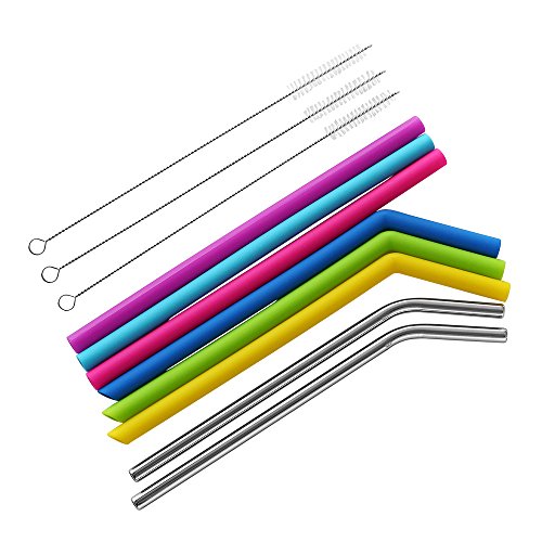 Reusable Silicone Drinking Straws By QLL, Set of 8, 3 Free Cleaning Brush Included