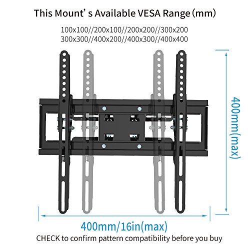 FITS 23"-65" TVs UP TO VESA 400 AND 88LBSHigh-grade Cold-rolled Steel Construction provides safety loading. This TV wall mount tilting bracket fits most of 23"-65" TVs up to 88 lbs with max mounting holes 400mm x 400mm.