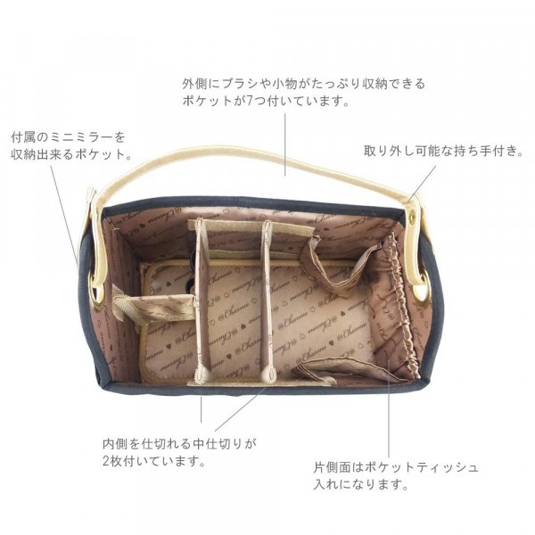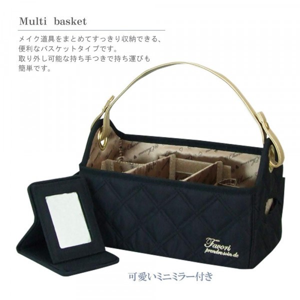 fk094igrjsメイク道具をまとめてすっきり収納できますミニミラー付き サイズ 幅24×奥行き13×高さ15cm 個装サイズ:24×13×15cm 重量 個装重量:384g 仕様 持ち手:取り外し可能 仕切り:内側を4つに仕切る中仕切り2枚 外ポケット:7個 内側:ギャザーポケット 付属品 ミラー(W8×D0.9×H11cm) 生産国 中国 メイク道具をすっきり収納 メイク道具をまとめてすっきり収納できますミニミラー付き