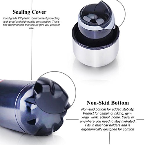 Stainless steel vacuum insulated water bottle: makes sure that your bottle stays cold inside without it sweating to the outside and hot without it burning your hand. • No more wet stains on any desk and no more cold coffee before reaching half a cup. • No more worrying when it drops • No more buying them on a regular • Fits in average car cup holders and backpack pockets. And just like any soda bottle, it's easy to drink from.Feature