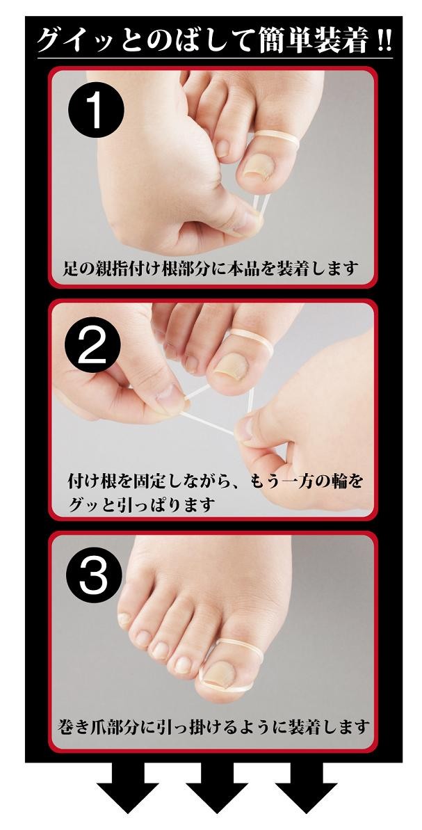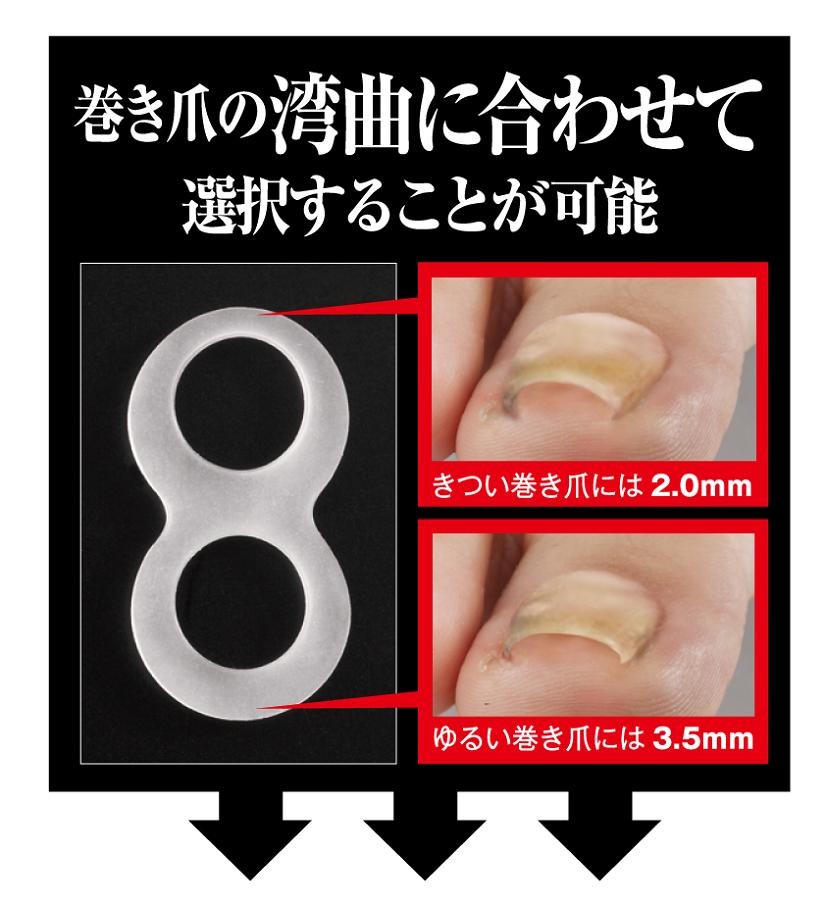| 使用上の注意 | ・ツメの白い部分を2mm以上延ばしてご使用いただくようお願いします。 ・乳幼児の手の届かないところに保管してください。 ・使用時にうっ血や痛み、痒みなどの異常を感じられた場合は使用をおやめください。 ・過度に力をかけた場合、破損の恐れがございますのでご注意ください。 ・使用していくうちに商品に変色が見られても、機能に変化はございませんのでそのままご使用いただけます。 ・就寝中の装着はおやめください。 ・巻き爪で治療中の方は専門に野ご相談のうえで使用してください。 ・爪がもろい方、足指や爪を治療中の方、水虫の方、極端に爪が長い方、爪の彎曲で炎症を起こしている方、あまりにも彎曲がひどい方は絶対に使用しないでください。 |