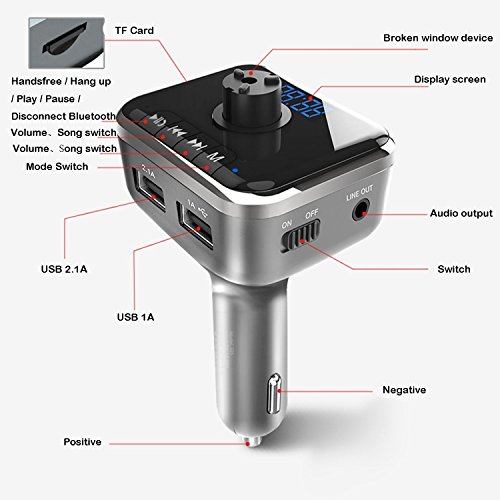 - Multifunctional Design: The wireless in-car Bluetooth transmitter with emergency escape tool, supporting dual USB car charging, hands-free calls, data transmission by TF card and car battery voltage detection display