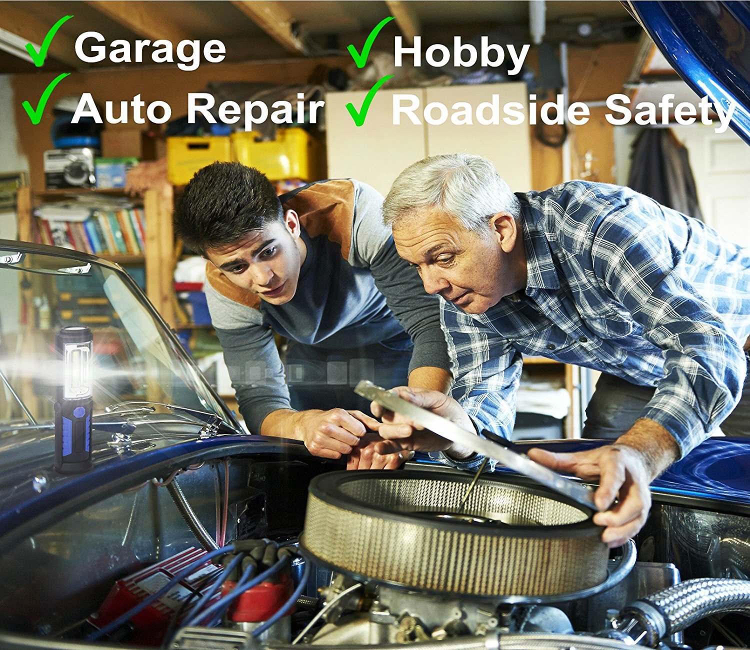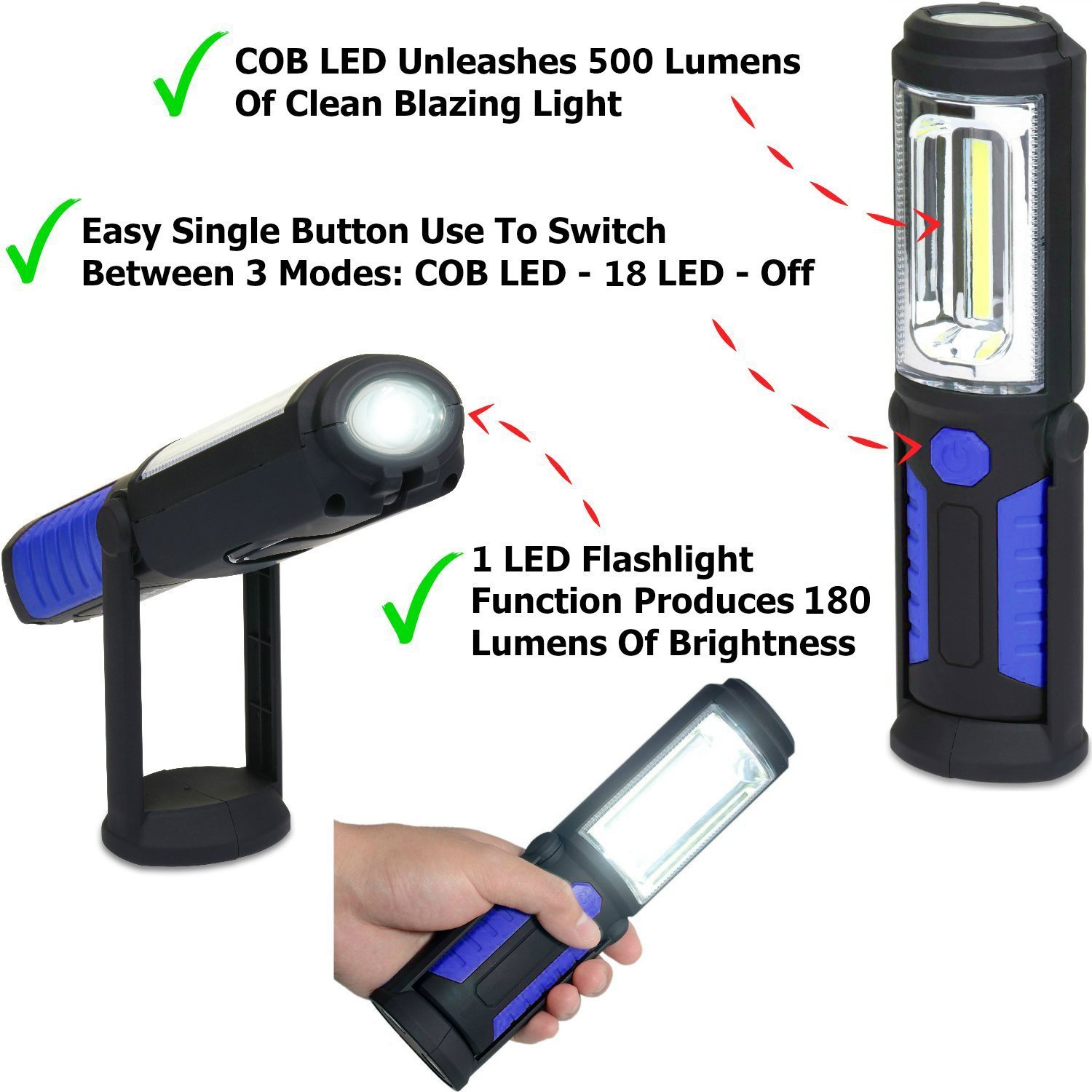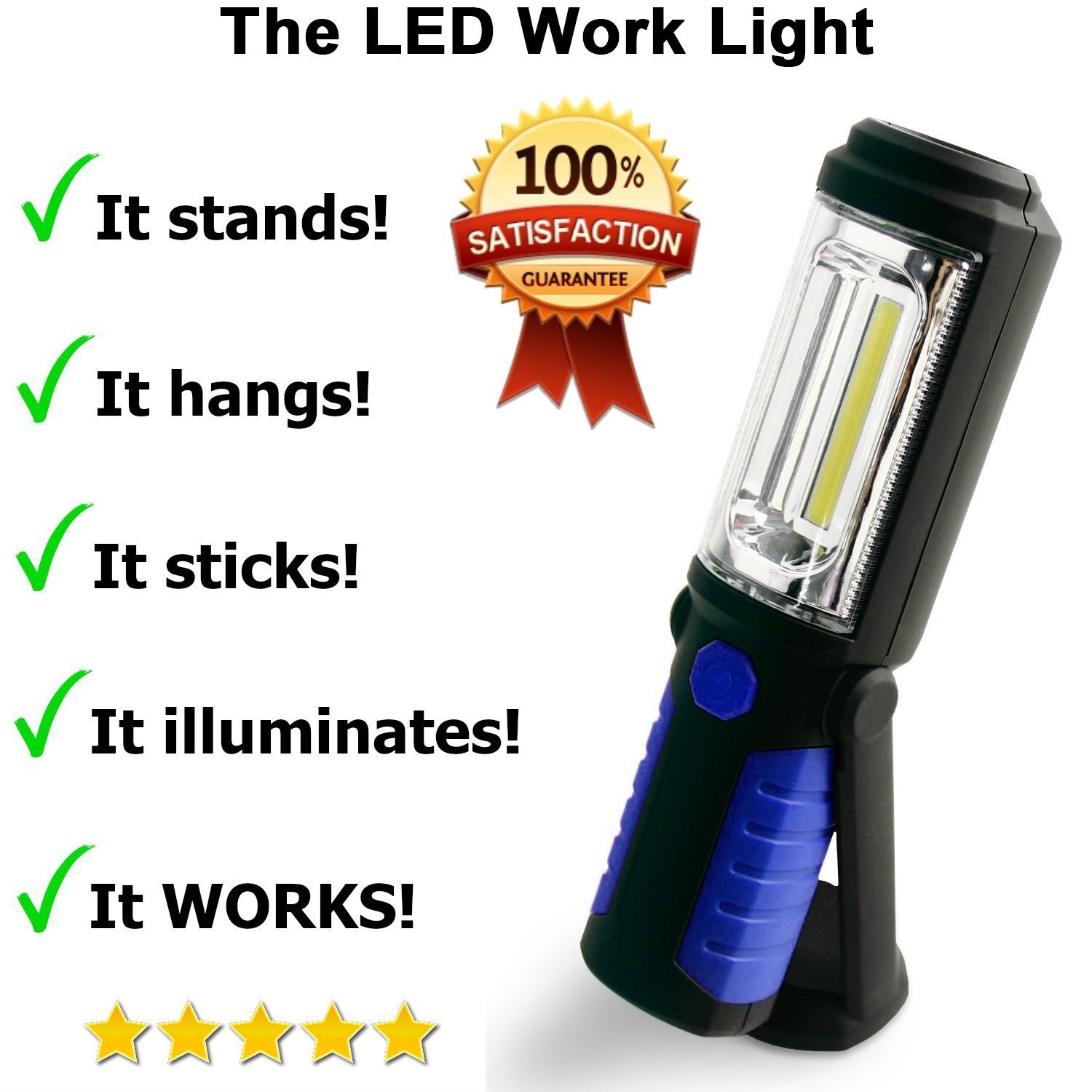SUPER BRIGHT:The LED Work Light Flashlight is composed of 3W front light LED Lamp beads , COB Chip 18 LED Lamp beads and 10W glare.The powerful COB LED unleashes 500 lumens of clean blazing light. With Very high-performance ,Plus High - quality smooth coating reflective cup ,Making the LED work lights can be high-level reflective. So you don’t need to worry the bright.
