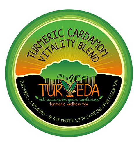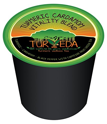 -. Feature : Curcumin Infused Tea--Turmeric Cardamom Black Pepper Vitality Tea (w/ Caffeine from Green Tea) / Add milk or almond milk to create your own delicious energy Turmeric Cardamom Latte / 400mg of 95% Curcumin per Single Serve Cup (equal to 20g of raw Turmeric), 150mg of natural Caffeine from Green Tea, Enhanced Curcumin Absorption / No Artificial Ingredients, Gluten-Free, NON GMO, Vegan, Sugar Free / Single serve cups (recyclable), Compatible with most Keurig K-Cup Brewers including the new Keurig 2.0 brewer and other single serve k-cup equipment; This product is not affiliated with Keurig, Incorporated. Perfect Coffee Substitute/Alternative.