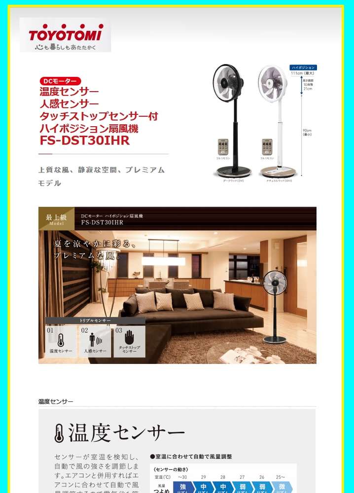 ●温度センサーー・人感センサー・タッチストップセンサーの「3センサー」搭載DC扇風機。