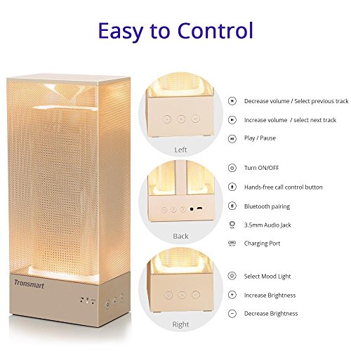 Studio : Tronsmart Publisher : Tronsmart Binding : Wireless Phone Accessory Product Description TRONSMART Tronsmart BEAM BLUETOOTH SPEAKER Tronsmart proudly presents Beam , Programmable LED lights with customizable brightness with your music can be a great gift for Christmas Day or a perfect choice for the couple to create a romantic atmosphere/surprise. Steady Connection With Bluetooth 4.1 Unique wireless technology makes a steady and unbreakable connection with all Bluetooth devices: iPhone, Android, iPod, iPad, Mac, PC - any cell phone, smartphone, tablet or laptop. 18 Hours Of Continuous Playback Tronsmart Beam lets you play music up to 18 hours with the mood lights on. Built-in Microphone No need to disconnect your phone - make calls hands-free due to high-quality sensitive microphone. Specification Bluetooth: 4.1 Transmission distance: ≤10M USB charging voltage: DC 5V/500mA Built-in battery: 4000mAh Output power: 7.5W x 2 Frequency response: 90Hz-20KHz Sensitivity: 80db±2db S/N ratio: ≥76dB Dimensions Weight Dimensions: 10cm*6.5cm*23.1cm Weight: 710.9g Package Contents 1 x Speaker 1 x USB cable 1 x User manual 1 x 3.5mm Aux Cable 0 |