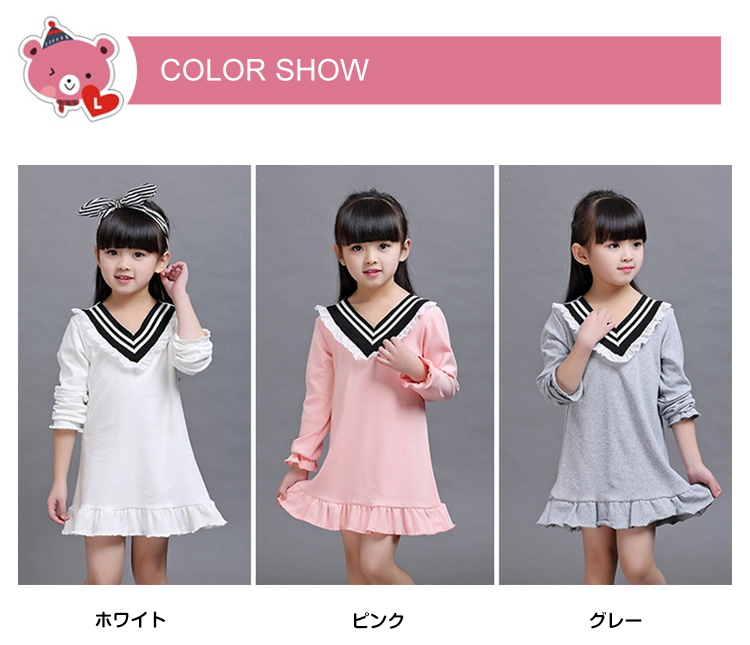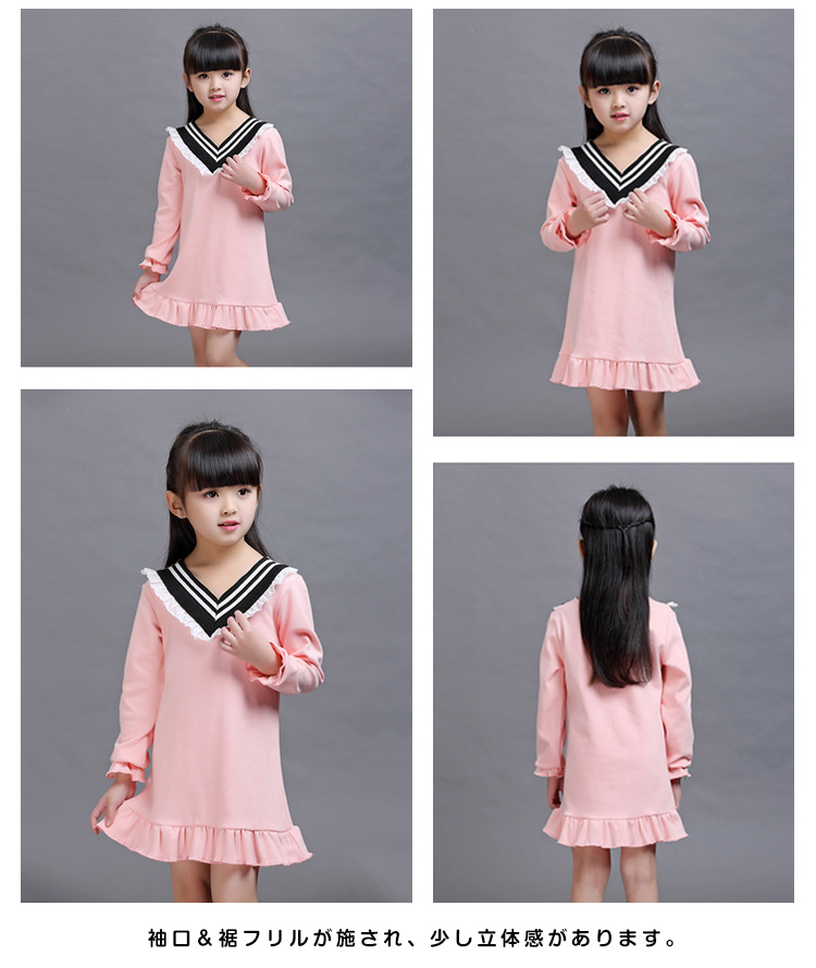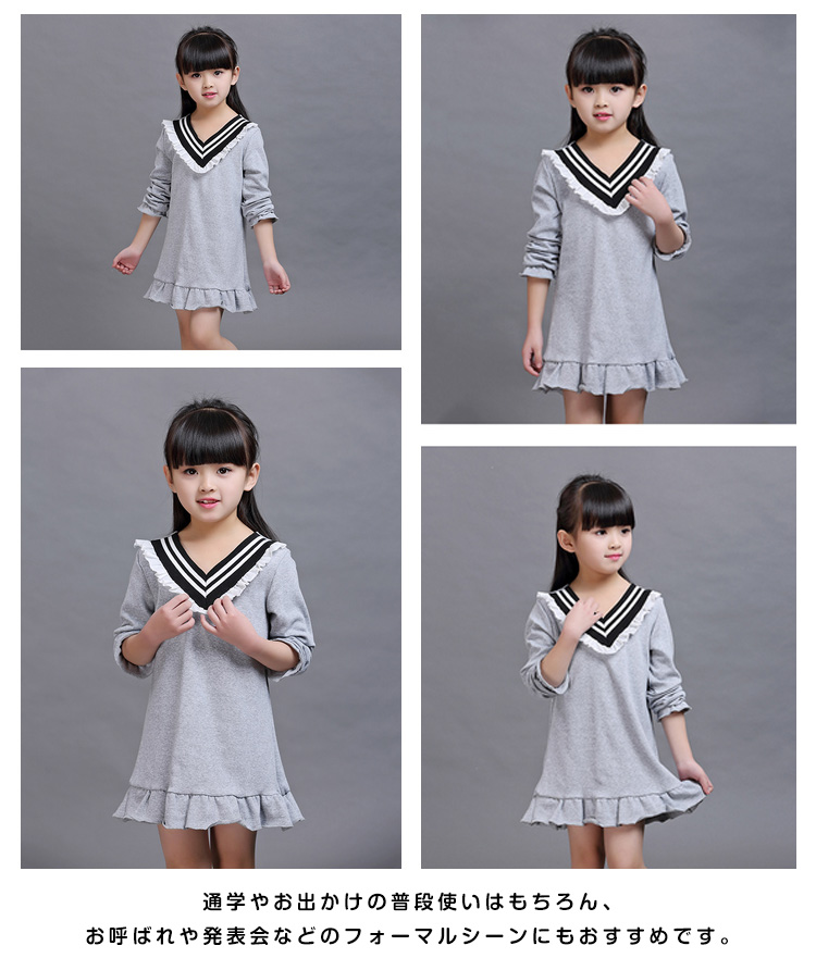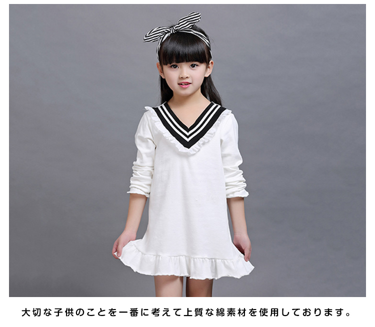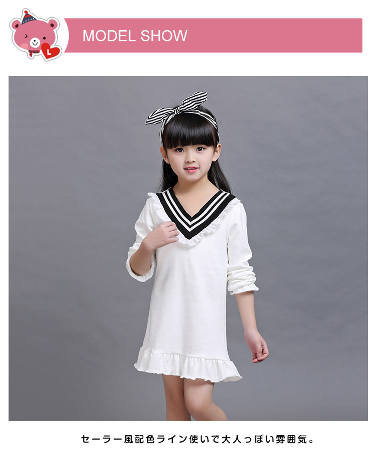 | シンプルなのに着映えする、大人顔らしいVネックワンピース。セーラー風配色ライン使いで大人っぽい雰囲気。深く開いたVネックが首元がすっきりと見えます。袖口&裾フリルが施され、少し立体感があります。大切な子供のことを一番に考えて上質な綿素材を使用しております。通学やお出かけの普段使いはもちろん、お呼ばれや発表会などのフォーマルシーンにもおすすめです。 | |