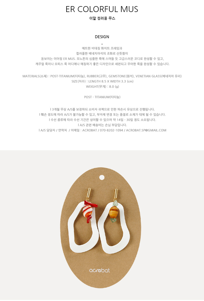 l 매트한 비대칭 화이트 프레임과 컬러풀한 베네치아석의 조화로 산뜻함이 돋보이는 이어링 ER MUS. 모노톤의 심플한 룩에 스며들 듯 고급스러운 코디로 완성할 수 있고, 캐주얼 룩이나 오피스 룩 어디에나 매칭하기 좋은 디자인으로 세련되고 우아한 룩을 완성할 수 있습니다.