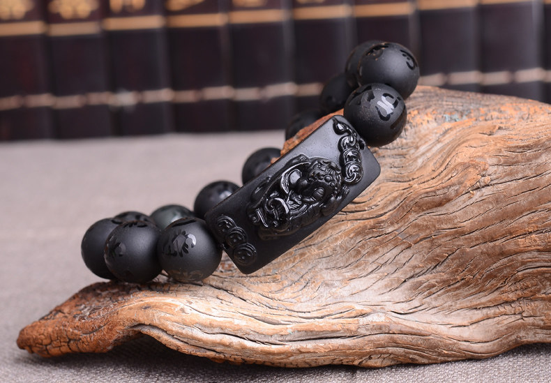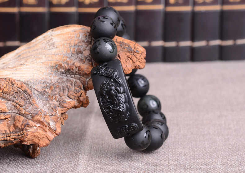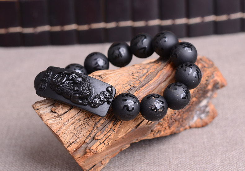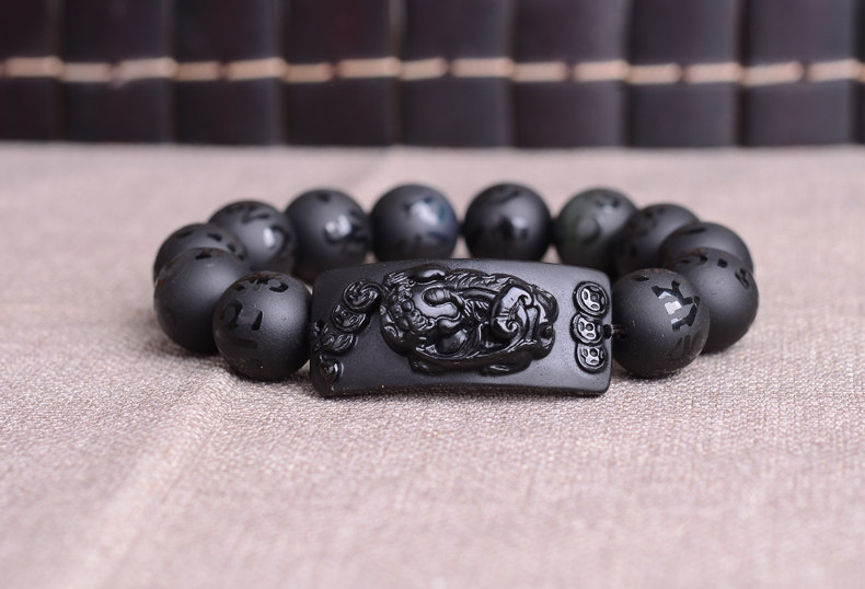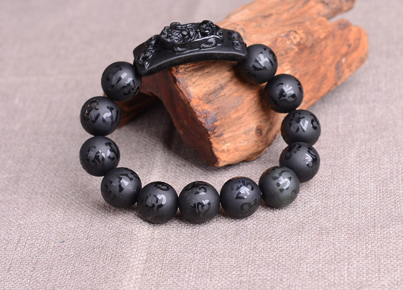 开光天然黑曜石貔貅手链 六字真言貔貅男士手牌 情侣款