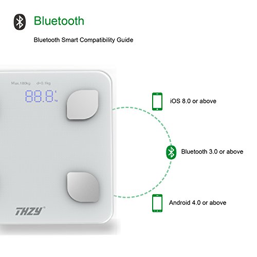 Feature: -THZY bluetooth body fat scale is made of impact resistance tempered glass which is four times stronger than normal glass, boasts a reflective surface and elegant design. -Three weigh units: kg/ lb/ st:lb -Anti-rollover bottom design -Low power and overload automatic displayed