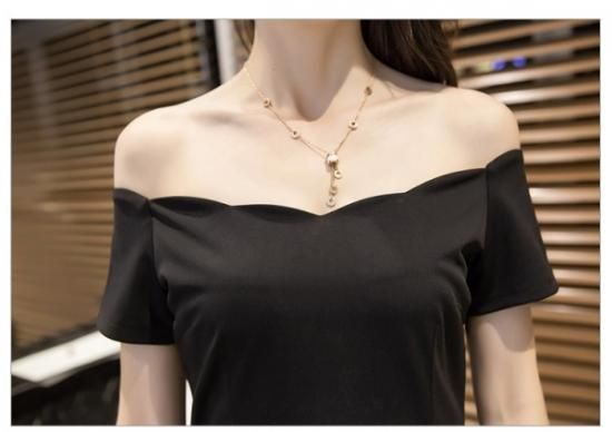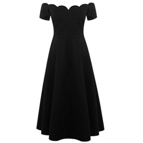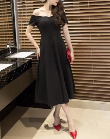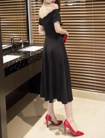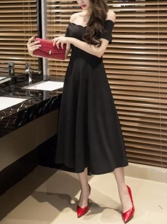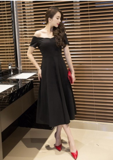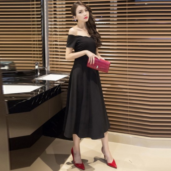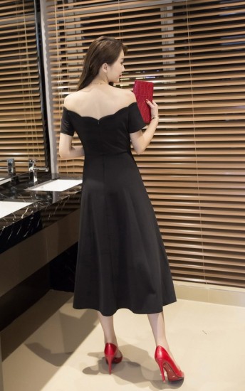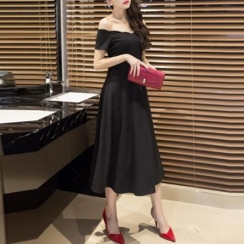 パーティードレス ミモレ丈 ワンピース オープンオフショルダー ハイウエスト ブラック 大人 上品 お呼ばれ drgz2592