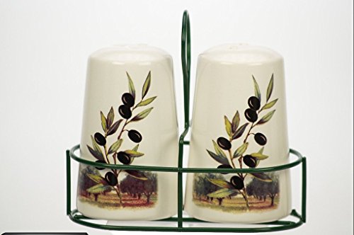 Ceramic Olive Design Salt & Pepper Shakers in Wire Holder