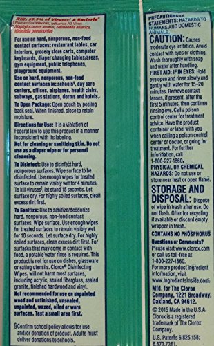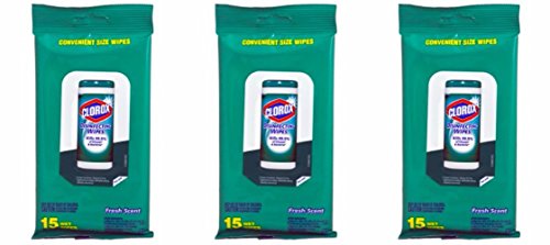 -. Feature : 3 Packs Clorox Disinfecting Travel Wipes / 45 total wipes / Convenient resealable pouches / Kills 99.9% of viruses and bacteria / Wipe size: 7 x 6 inches (17 cm x 5 cm)