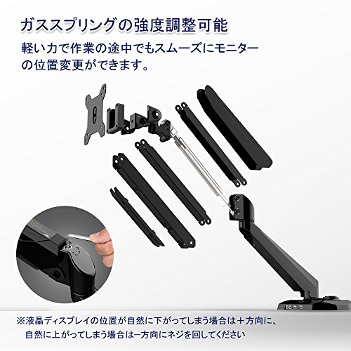 You can adjust the smooth height in [gas spring arm] gas spring, it is a multi-joint type of movement in the horizontal direction can be freely. Product warranty period ※: one year [2 kinds of mounting method of the present product, in accordance with the attached desk There are two types of method of attaching the grommet and clamp. [Freely adjust the attachment is a simple monitor the position of the monitor] the monitor mounting portion is complete only in the plug to the body. The monitor position up and down adjustable! [※ Please note: BESTEK because the product is only Ltd. Investec Group is a dealer, pay attention please] left and right of the screen in the joint portion of the holder [adjustable the angle of the screen], up and down It can be adjusted to. ※ by the monitor to be installed, there are times when the upper and lower left and right angle adjustment range is limited than usual. ※ Gala spring strength at the factory has been set to about 8kg. If you install as it is heavy display, because there is that the display is reduced vigorously, please install with care.