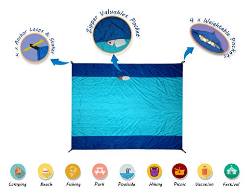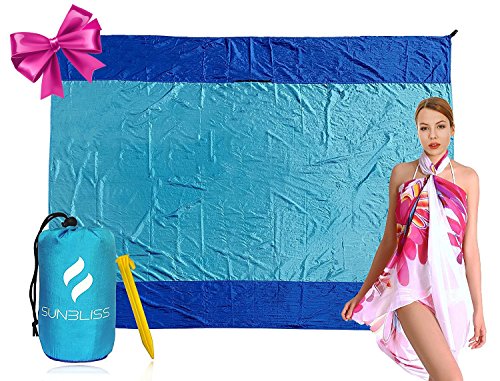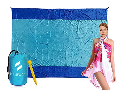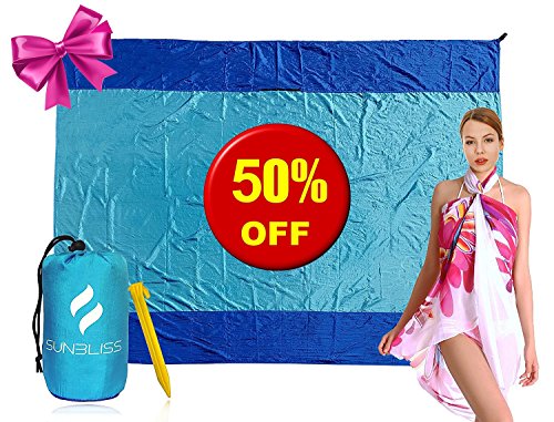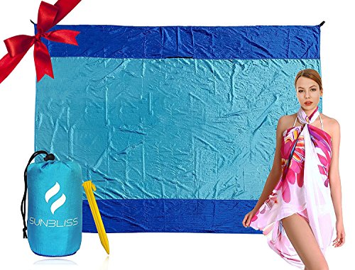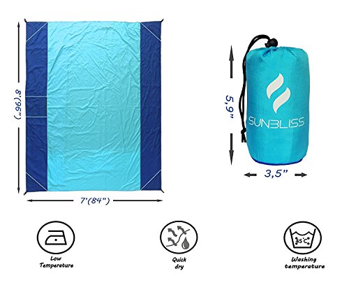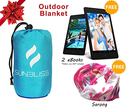 SUNBLISS Blanket BENEFITS: EXCELLENT MATERIAL Our beach blanket is made of parachute nylon and that means it's durable. Also it will quick-dry. MULTI-PURPOSE You can use it as an overall travel blanket for many outdoor activities like beach, as a picnic blanket, when going hiking or even at a concert, our blanket is big enough for the whole family. OVERSIZED AND COMPACT - Very large when unpacked, very compact when carried in it's pouch. You will love it! PORTABLE AND LIGHTWEIGHT - Packs down into a small bag, weighing just 1 lb. You can take this picnic blanket anywhere, making it an ideal travel blanket, with a generous size. ZIPPERED VALUABLES POCKET - The zippered pocket is big enough to store your personal items. WEIGHTED CORNERS AND ANCHORED - Blanket has 4 underside corner pockets that you can fill with sand. (Reinforced anchoring.) SAND PROOF With just a shake or wipe, the sand will not stick to the blanket. DURABLE, BREATHABLE, CLEANS AND DRIES FAST FREE BONUS - LOVELY SARONG measuring: 40" x 57" and with every order of our beach blanket, you also get these 2 amazing eBooks, AT NO COST, delivered to you by e-mail. 100% SATISFACTION GUARANTEE , backed by our MANUFACTURER money back guarantee. If you are not happy with our beach blanket, you can just return it within 100 DAYS and we will refund you 100% no questions asked. ZERO RISK PURCHASE - Your premium SUNBLISS Blanket is 100% QUALITY PRODUCT so that you have 6 months full replacement warranty. 0 |