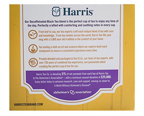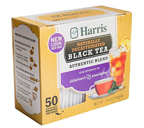 -. Binding : Grocery -. Brand : Harris -. Feature : 105 mg of antioxidants per serving / Serve Iced or Hot. / Harris Decaffeinated Black Tea is quality packed in a four-sided bag for faster, more flavorful brewing. / Harris Naturally Decaffeinated Black Tea gives you all the flavor of regular tea. It's ideal for anyone who wants to limit caffeine. / Environmentally-Sensitive, Too. The special paper used in these tea bags is processed with no harsh chemicals that could affect flavor or contribute to environmental problems. -. Label : Harris -. Manufacturer : Harris -. NumberOfItems : 12 -. PackageQuantity : 12 -. ProductGroup : Grocery -. ProductTypeName : GROCERY -. Publisher : Harris -. ReleaseDate : 2008-03-25 -. Size : 3.4 Ounces -. Studio : Harris -. Title : Harris Decaffeinated Black Tea, 50 Tea Bags, 3.4-Ounce Boxes (Pack of 12)