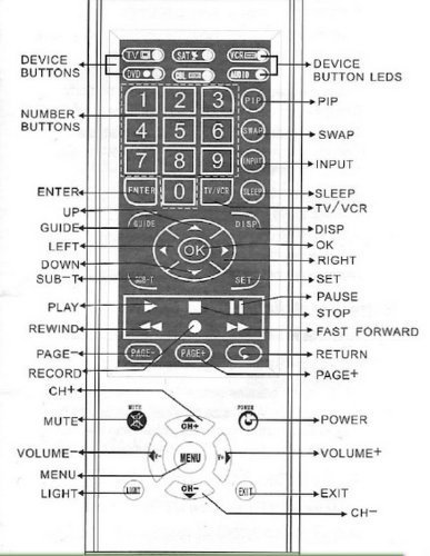-. Feature : Control all you devices with one Universal Remote / Backlit Touch Panel / Controls your TV, DVD, VCR, Satellite Receiver, Cable Box and Audio Device / requires 2 AAA batteries