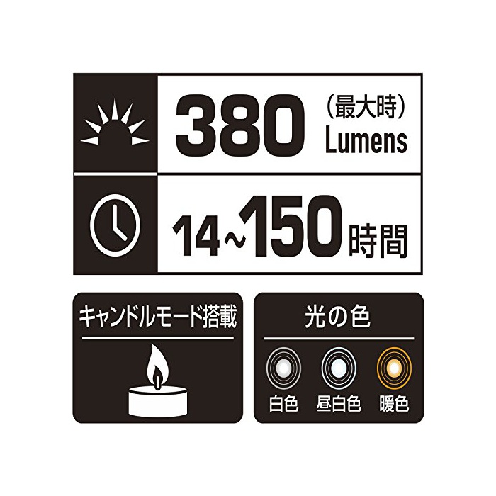 실용 점등:Hi(주백색)/14시간,Hi(백색)/24시간,Hi(난색)/28시간,Low(주백색)/110시간,Low(백색)/140시간,Low(난색)/150시간,캔들(양초) 모드/90시간