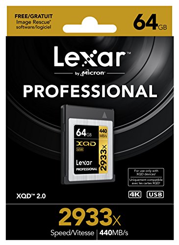 Capture stunning, high-quality images, and 4K video with the Lexar Professional 2933x XQD 2.0 card. Designed for use with the latest generation of DSLR cameras, the card supports both PCI Express Gen 2 and USB 3.0 interfaces, and provides high-speed performance, durability, and reliability, with a read transfer speed up to 2933x (440MB/s). This improves transfer speed from card to computer, dramatically accelerating workflow. The Professional 2933x XQD 2.0 card is available in large capacities from 32GB to 128GB, includes a lifetime copy of downloadable Image Rescue software, and comes backed by expert technical support and a limited lifetime warranty.Feature