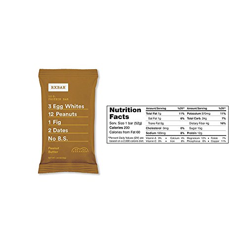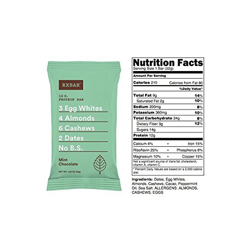 -. Feature : RXBARs are whole food protein bars with just 6 to 8 whole food ingredients / Try all 8 Flavors: Mint Chocolate, Coconut Chocolate, Blueberry, Chocolate Sea Salt, Peanut Butter, Coffee Chocolate, Apple Cinnamon, and Pumpkin Spice / No added sugar, no gluten, no soy, no dairy, no GMO, no B.S. / 12g of egg white protein, 4g of fiber, 200 calories. Paleo-Friendly and Whole30 Compliant. / Perfect as a breakfast bar on-the-go, snack bar between meals, or as an energy bar before/after a workout. These nutritional bars are kind to your body and will help on your quest to a better diet.