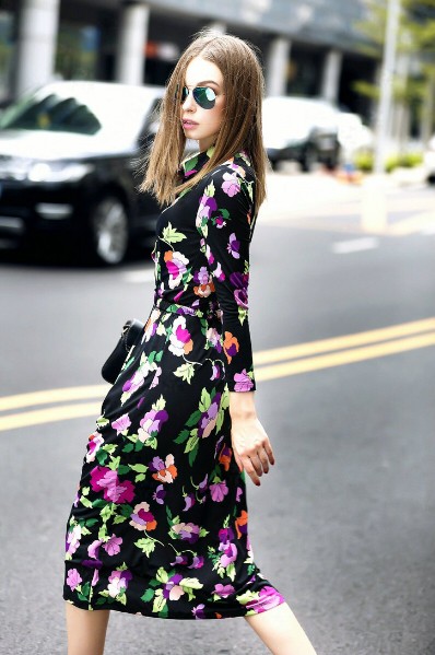 個性的な花柄 ハイウエスト 長袖 マキシ丈ワンピース