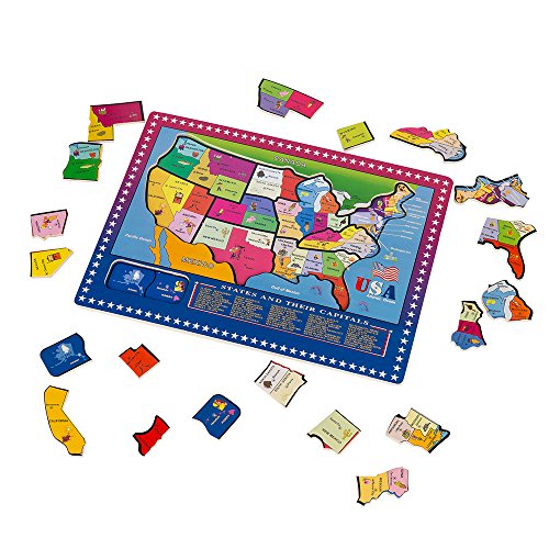 -. Feature : 21 PIECE WOODEN USA MAP PUZZLE: Made of sturdy plywood, smooth wood pieces fit nicely, raised pieces for easy lifting, handwriting lined text under pieces. P.R.Inting is clear. Edges are cut well. Size about 11. 8x15. 75 inches / FUN AND EASY USE: The usa states puzzle is favourite with many Preschool to study geography. Bright color and smooth edge. Not only parent can interact with kid, but also kid play the map puzzle lays flat / DESIGN THAT TRIPLES YOUR VALUE: Have fun exploring the different regions of our nation with this exciting interactive map. Puzzle pieces include the capital city and interesting locations and sights for each state, inspires geographic awareness in a fun and interactive medium / EDUCATIONAL TOY FOR CHINDREN: 50 beautifully illustrated, improve geographical knowledge, encourages problem solving, interaction and creative storytelling / SAFE FOR CHILDREN: Easy-clean surface to keep the puzzle looking like new, ideal for both home and school. Approved ASTM and CPSIA test, suitable for 3 year old and plus