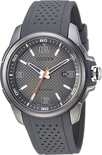 Citizen Eco-Drive™ FAQ Watch Sizing Guide Jump into action with this built-for-champions Citizen® watch. Stainless steel case. Polyurethane strap with adjustable buckle closure. Round face. Three-hand analog display with quartz movement. Dial features white and orange-tone hands and hour markers, date display window, minute track, and Citizen detailing. Water resistant 330 feet. Display case included. Imported. Citizen Watch offers a five-year limited manufacturer's warranty on all their products. For more information, please visit their website and see the "Service Information" section. Measurements: Case Height: 40 2⁄5 mm Case Width: 40 2⁄5 mm Case Depth: 11 1⁄2 mm Band Width: 21 1⁄5 mm Band Circumference/Length: 10 in Weight: 2.8 oz This product may have a manufacturer's warranty. Please visit the manufacturer's website or contact us at warranty@support.zappos.com for full manufacturer warranty details.Feature