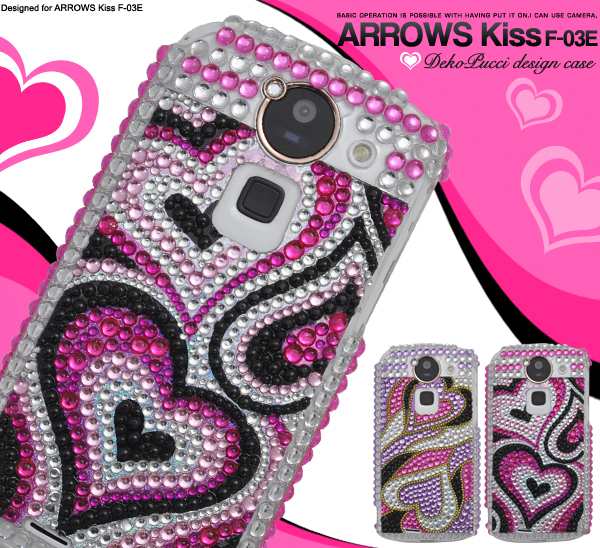 | 製品仕様 | | 対応機種 | ARROWS Kiss F-03E | | 種類 | 2種類 | | 注意 | ※ARROWS Kiss F-03Eは付属しません。※ライセンス商品ではありません。 ※ラインストーンが貼られていない余白部分が若干ございます。 ※衝撃を与えると、ラインストーンが取れる場合があります。 |