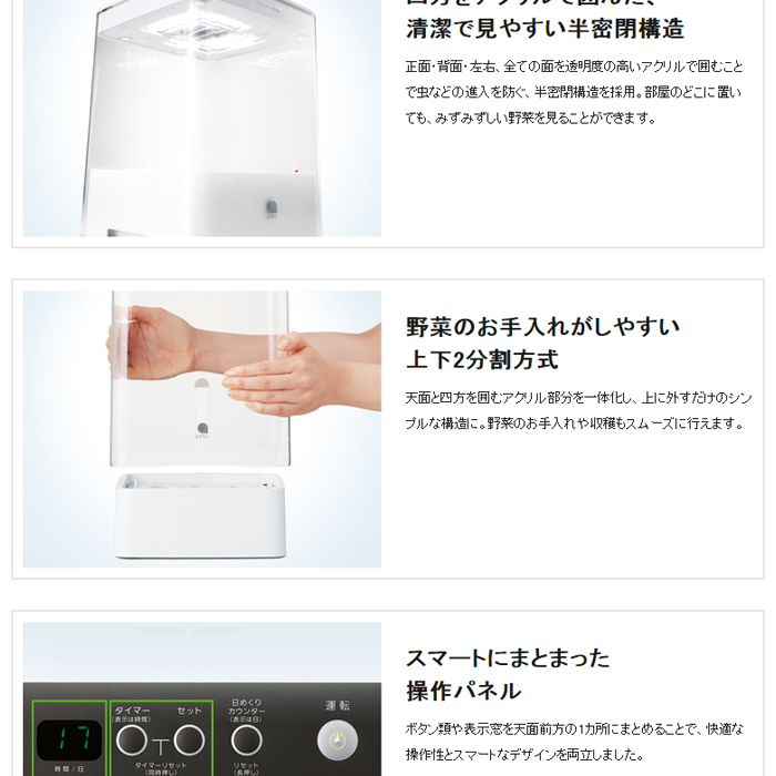 ●正面・背面・左右、全ての面を透明度の高いアクリルで囲むことで虫などの進入を防ぐ、半密閉構造を採用。部屋のどこに置いても、みずみずしい野菜を見ることができます