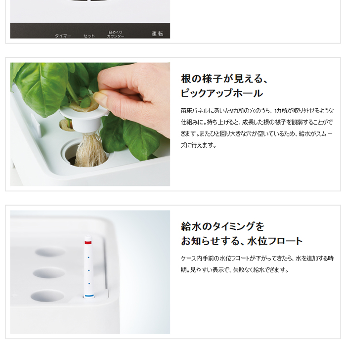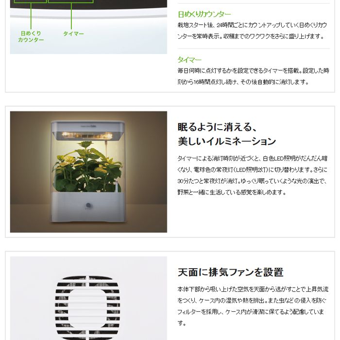 ●眠るように消える、美しいイルミネーション。タイマーによる消灯時刻が近づくと、白色LED照明がだんだん暗くなり、電球色の常夜灯(LED照明2灯)に切り替わります。さらに30分たつと常夜灯が消灯。ゆっくり眠っていくような光の演出で、野菜と一緒に生活している感覚を楽しめます