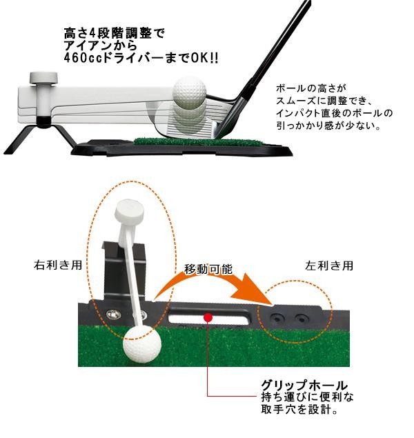 | ゴルフの基本であるスイング練習をご自宅で!!左利き用にも変身します。高さ4段階調整でアイアンから460ccドライバーまで対応します!! |