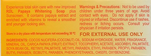 Experience a total skin care with new improved RDL Papaya Whitening Soap plus Sunscreen. It contains papaya extract and enriched with vitamins (A, C & E) to reveal a smoother younger looking skin
