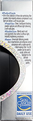 Perfect Finish: All-in-One collection of three skin-perfecting filter powders that instantly enhance complexion in any light and deliver a soft-focused glow: Nude Filter: Sheer, translucent finishing powder captures and diffuses light delivering a soft nude glow Healthy Glow: Blends warm and cool pigments that soften and diffuse light, instantly brightening complexion. Sunset: Universally flattering powder, blurs imperfections and enhances overall complexion with a subtle warmth. Multi-tasking Filter Trio BB Powder can be used to sculpt, define and highlight for the ultimate contouring palette. Featuring InstaFilter Technology, a proprietary blend of mattifying and pore balancing spherical beads, color filter pigments and high-tech polymers that work together to instantly optimize light reflection, blur imperfections and visibly retexturize skin, while protecting against UVA/UVB damage with SPF 30.Feature