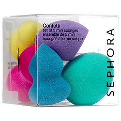 -. Feature : Sephora Confetti Set of 5 Uniquely-Shaped Mini Sponges / A set of five Mini Sponges for precision application and superior results. (Each Sponge is Approx. 1" tall) / Each of these sponges is uniquely designed to buff into the smallest corners of the face, or apply a full face of foundation depending on the desired effect. They work well with liquids, powders, creams, and mineral pigments to provide sheer, buildable coverage. Each sponge allows for both detailed application-such as concealing and blending in hard to reach places-and smoothing and buffing product all over the forehead, cheeks, and chin. / This set contains: - 5 x Uniquely shaped makeup sponges / What else you need to know: This collection features favorite SEPHORA COLLECTION shapes in a smaller size. Sponges are latex-free.