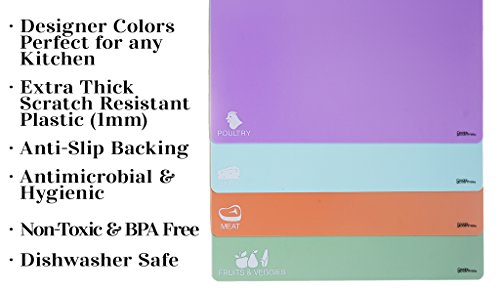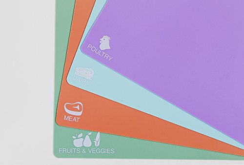 Best Kitchen Cutting Mats, Extra Thick Plastic, Non-Slip, Colorful Flexible Cutting Board Sheets and Chopping Boards, Easy to Clean, Set of 4 Cute Colored Mats with Food Icons