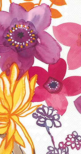 - Design features purple, pink and orange flowers in a painterly watercolor style on a white background