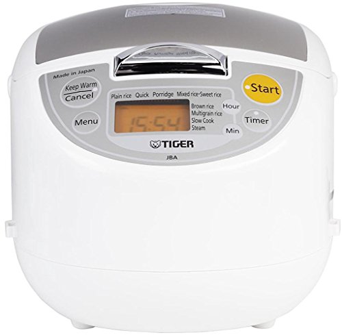 Tiger Micom controlled rice cooker and warmer comes with 3-in-1 functions (multi-menu rice cooking, steamer, and slow cooker) and 9 computerized cooking menu settings (Plain Rice, Quick Rice, Porridge, Mixed Rice, Sweet Rice, Brown Rice, Multigrain Rice, Slow Cook and Steamer). With minimal preparation and the press of a button, Tiger's automatic cooking logic system actively monitors cooking temperatures to create the perfect meal. Other highlights include an easy to remove and washable inner lid and steam cap, an easy to read LCD control panel, automatic keep warm function after the rice is cooked, and a delay timer. The product's dimension is 9.7-inch W x 13.3-inch L x 8.4-inch H and the wattage to this rice cooker and warmer is 641-watts.Feature