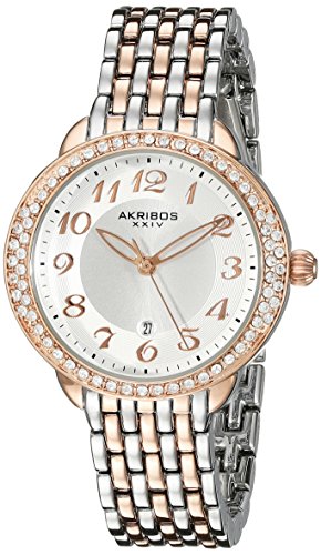 This beautiful and elegant AKRIBOS XXIV women's timepiece features a petite 30mm case with a lovely two-tone rose gold and stainless steel finish and a Swarovski crystal studded bezel. The beautiful silver tone dial is home to hand-applied Arabic numeral markers. This watch is powered by an accurate and reliable Miyota quartz movement, which offers a classic three-hand indication. The case is adorned with a five-row bracelet with a matching two-tone finish.Feature