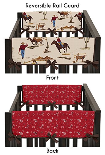 -. Feature : Features an exclusive cowboy P.R.Int fabric with coordinating chocolate brown ties. Reverses to red bandana P.R.Int. / 100% Cotton and Microsuede Fabrics / Set of 2 Side Rail Guards 27 in. x 18 in. ea. / Attaches easily with secure ties. Easy machine washing and drying. / This design has matching accessories such as window treatments, hampers, shower curtains, memory photo boards, body pillow cases and decorative pillows.