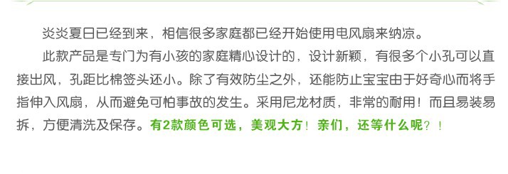 u0026nbsp;u0026nbsp;u0026nbsp;u0026nbsp;家里有小孩的更需要它,平时的风扇罩只是防尘,因为这款除了防尘外有了它防止你小孩把手指会放进风扇中,开风扇时不用脱,直接开就可以了,这款设计特别,有很多个小孔可以直接出风.