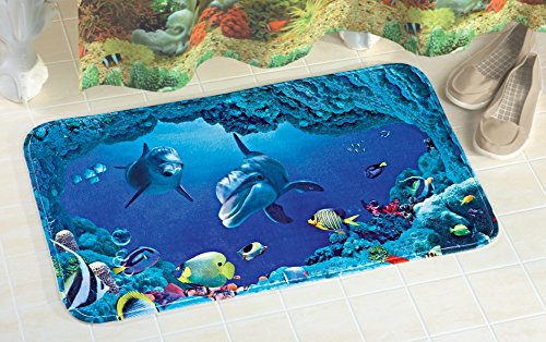 -. Feature : Bring the beauty of a tropical reef into your home with this bright and beautiful bath mat / Featuring dolphins, tropical fish, and colorful coral / Soft, cushioned mat has a skid-resistant backing / Measures 29" x 17" / SHOP COORDINATING ITEMS - Tip: Enter Item Info in Search Box: Dolphin and Seashell Suncatcher (CE-34128) , Dolphin Bay Ocean Life Bath Mat (CE-33581) , Dolphin Bay Under the Sea Shower Curtain (CE-11318) , Dolphin Coastal Decor Night Light (CE-33987) , Dolphin Family Tropical Mat (CE-38485)