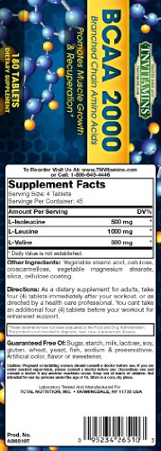-. Binding : Health and Beauty -. Brand : TNVitamins -. EAN : 0095234265103 -. Feature : Promotes Muscle Growth & Recuperation* / Important For Protein Metabolism.* / Branched Chained Amino Acids / Reduces Muscle Breakdown During Exercise. / Increase Protein Synthesis And Aid In Fat Loss. -. IsAdultProduct : 0 -. Label : TNVitamins -. LegalDisclaimer : Information provided is intended for general knowledge. It is not a substitute for professional medical advice or treatment for specific medical conditions. Always seek the advice of your physician or other qualified health care provider with questions you may have. Any information provided is not intended to diagnose, treat, cure or prevent any disease. These statements have not been evaluated by The USFDA. These products are not intended to diagnose, treat, cure or prevent any disease. -. Manufacturer : TNVitamins -. MPN : 095234265103 -. PackageQuantity : 1 -. PartNumber : 095234265103 -. ProductGroup : Health and Beauty -. ProductTypeName : HEALTH_PERSONAL_CARE -. Publisher : TNVitamins -. Size : 180 Tablets -. Studio : TNVitamins -. Title : BCAA 2000 Branched Chain Amino Acids - 180 Tablets -. UPC : 095234265103